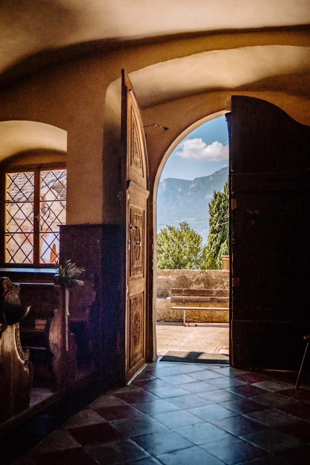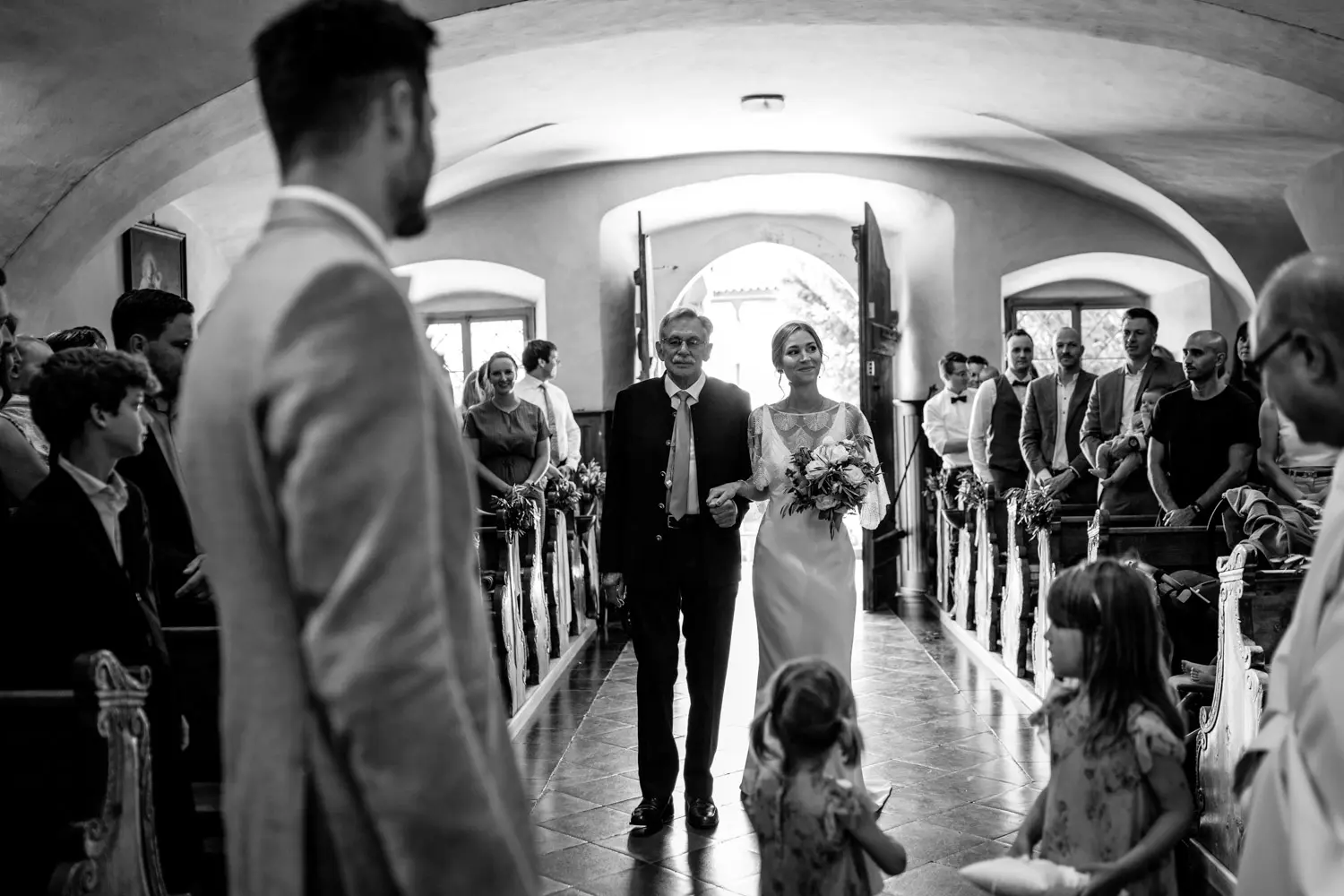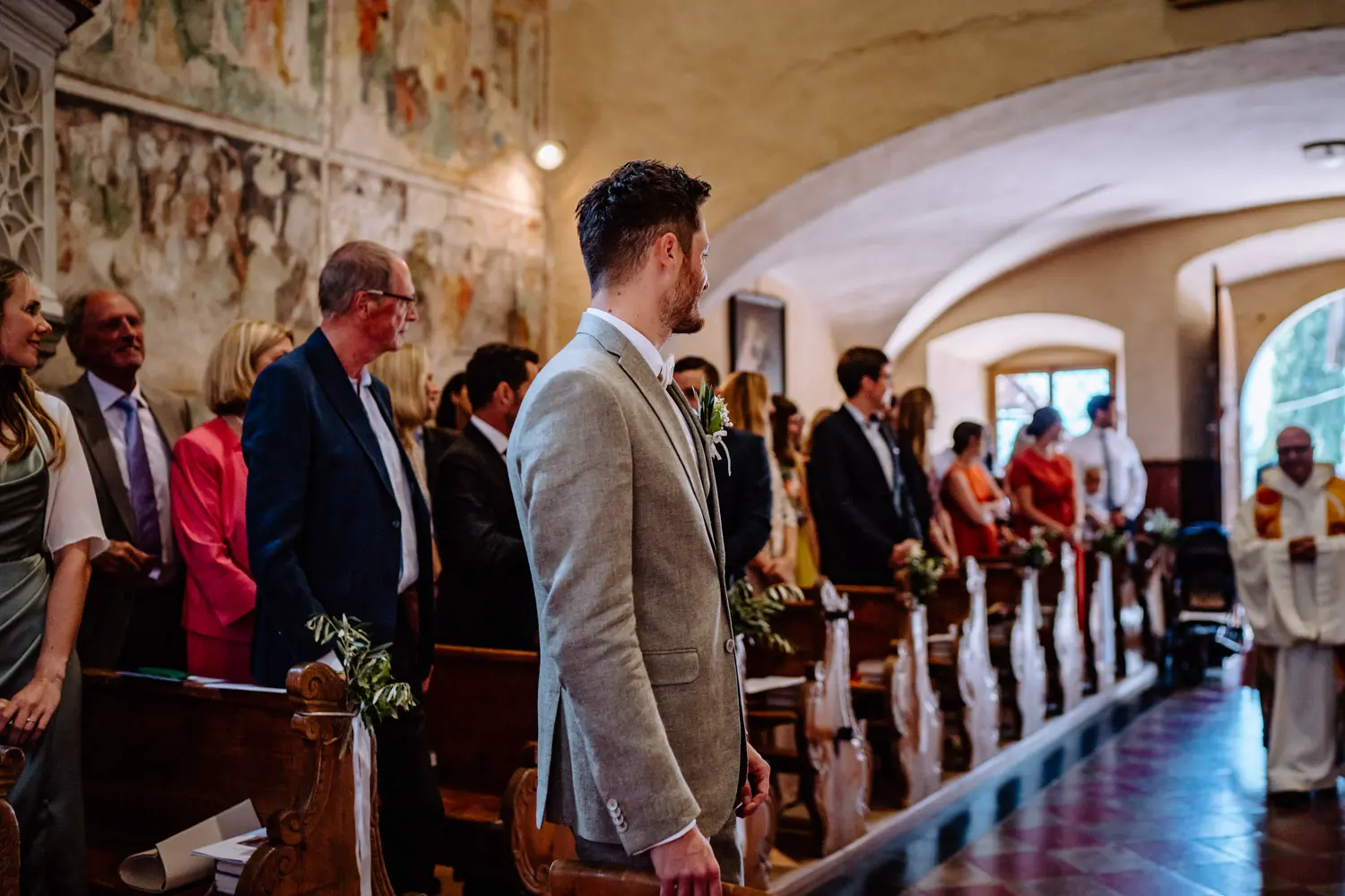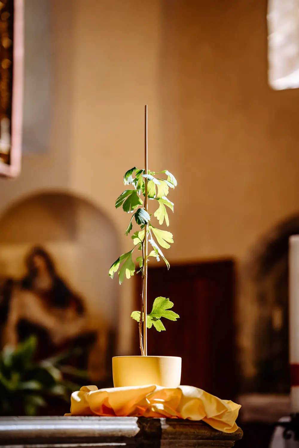 Die Zeremonie begann in der Kirche zum Heiligen Stefan in Pinzano, und der Anblick der atemberaubenden Braut Aurelia vor dem Kirchenportal raubte allen den Atem. Das Thema der Hochzeit, der Ginko-Baum, zog sich wie ein roter Faden durch den Tag, und seine Symbolik von Stärke und Liebe war überall präsent.