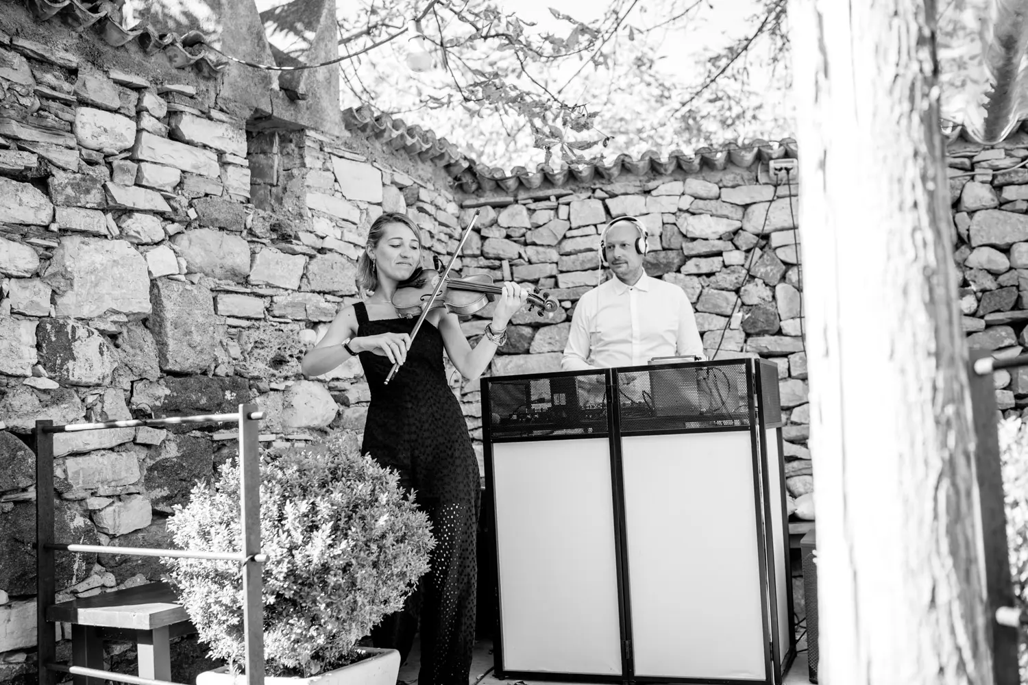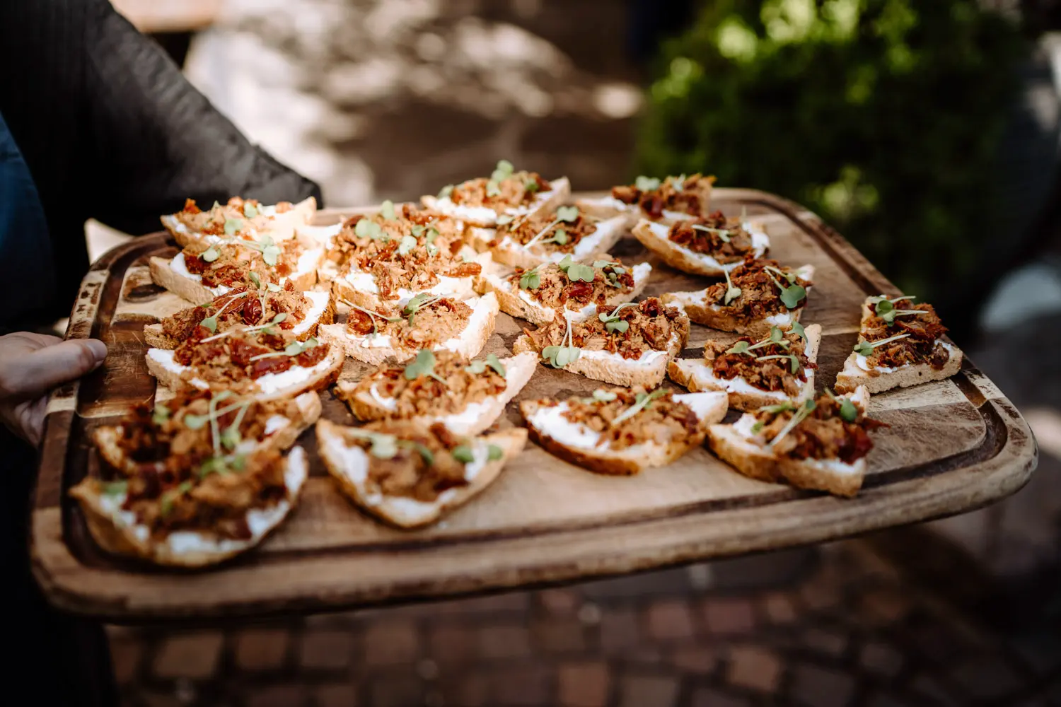 Danach versammelten sich die Gäste vor dem malerischen Pinzonerkeller, wo herzliche Glückwünsche ausgetauscht wurden. Umrahmt wurde das durch ein fantastisches Flying Buffet und einen Sektempfang. Gleichzeitig sorgten der DJ mit einer klassischen Geigerin für die musikalische Untermalung.