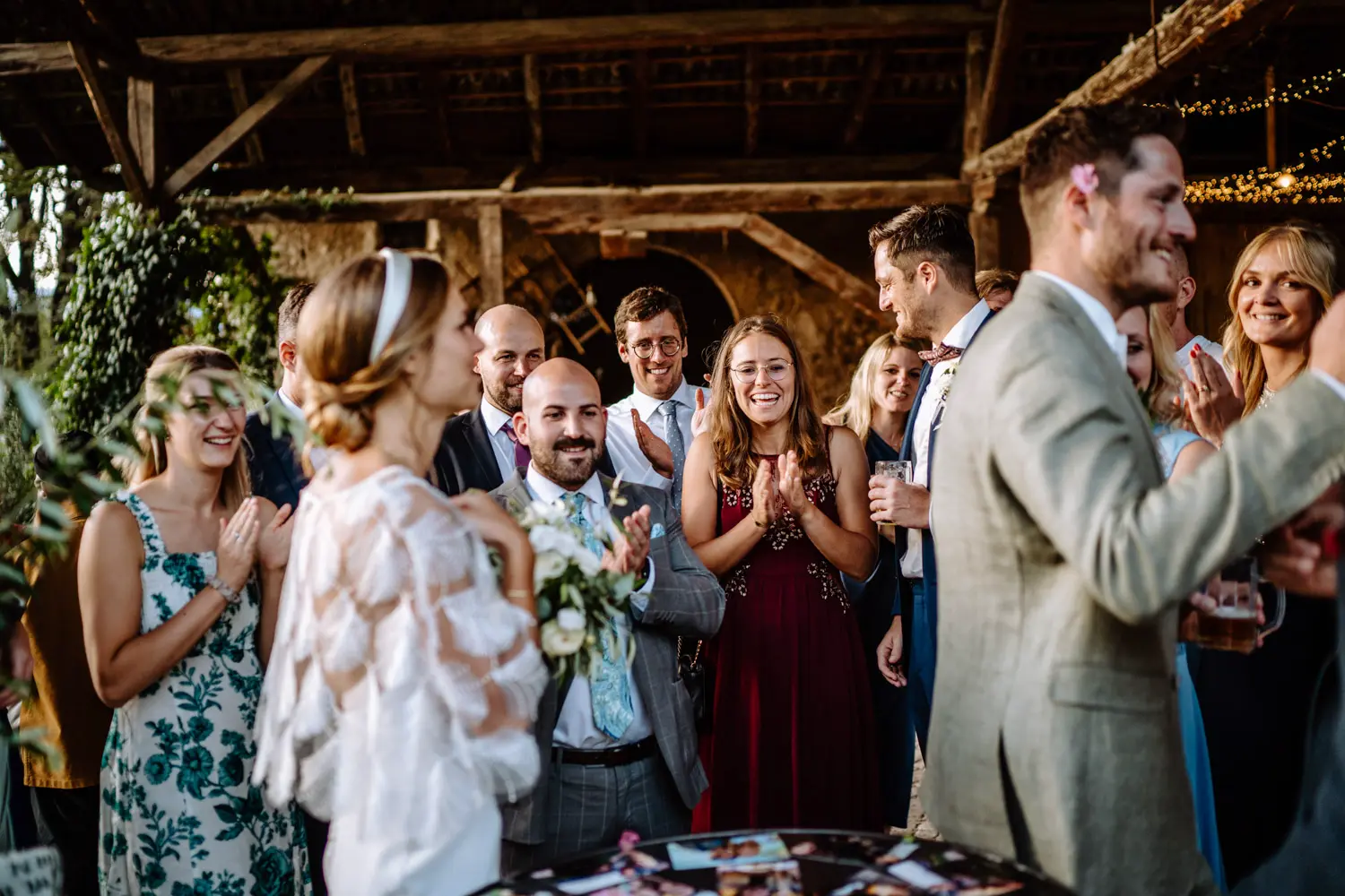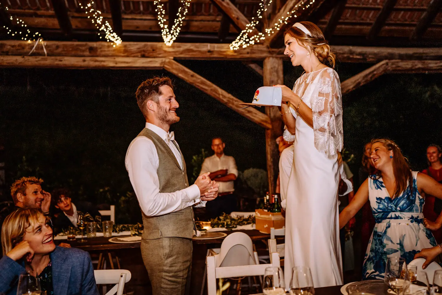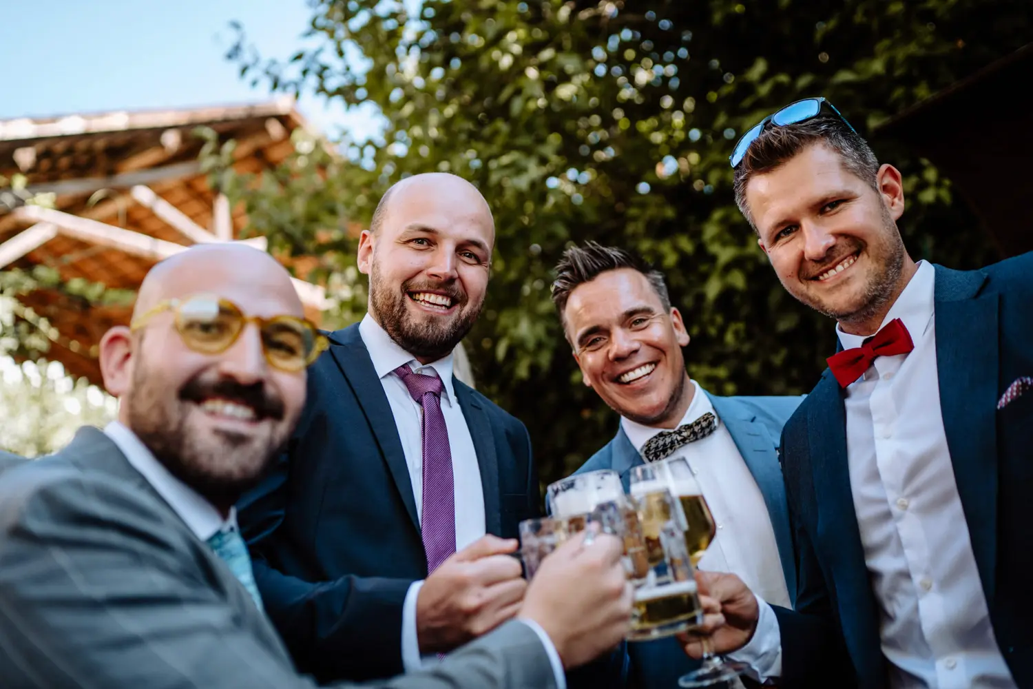 Der Höhepunkt des Abends war ohne Zweifel die ausgelassene Party im Partygewölbe des Pinzonerkellers. Mit DJ Marlon an den füllte sich der Raum schnell mit Energie, die Tanzfläche blieb nie leer. Die Musik, das Licht des Gewölbes und die besondere Umgebung sorgten für eine Stimmung, die sich immer weiter steigerte. Es wurde getanzt, gelacht und gefeiert, ohne auf die Uhr zu schauen. Bis tief in die Nacht hinein blieb die Atmosphäre mega, getragen von genau dieser Mischung aus guter Musik, vertrauten Menschen und der Freude über einen rundum gelungenen Hochzeitstag.