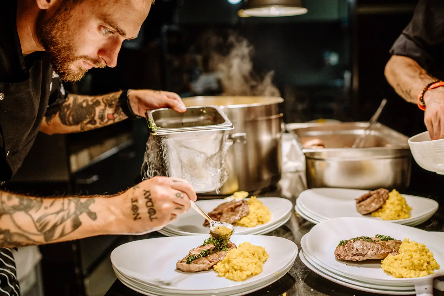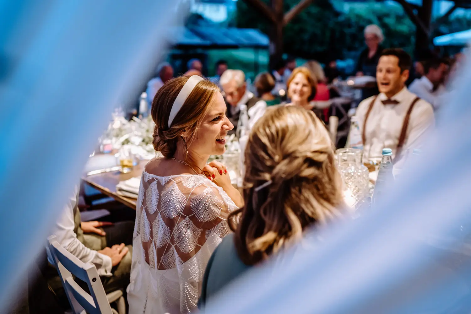 Das traumhafte Wetter machte es möglich, das Abendessen unter freiem Himmel im Pinzonerkeller zu genießen. In der warmen Abendluft wurde gelacht, angestoßen und miteinander gesprochen, während sich langsam eine gelöste, fast schon festliche Stimmung ausbreitete. Man spürte, dass der Tag sich seinem nächsten Höhepunkt näherte. Schon hier lag eine besondere Vorfreude in der Luft, auf den Hochzeitstanz, auf die Musik und auf eine lange Nacht, in der gefeiert werden durfte.