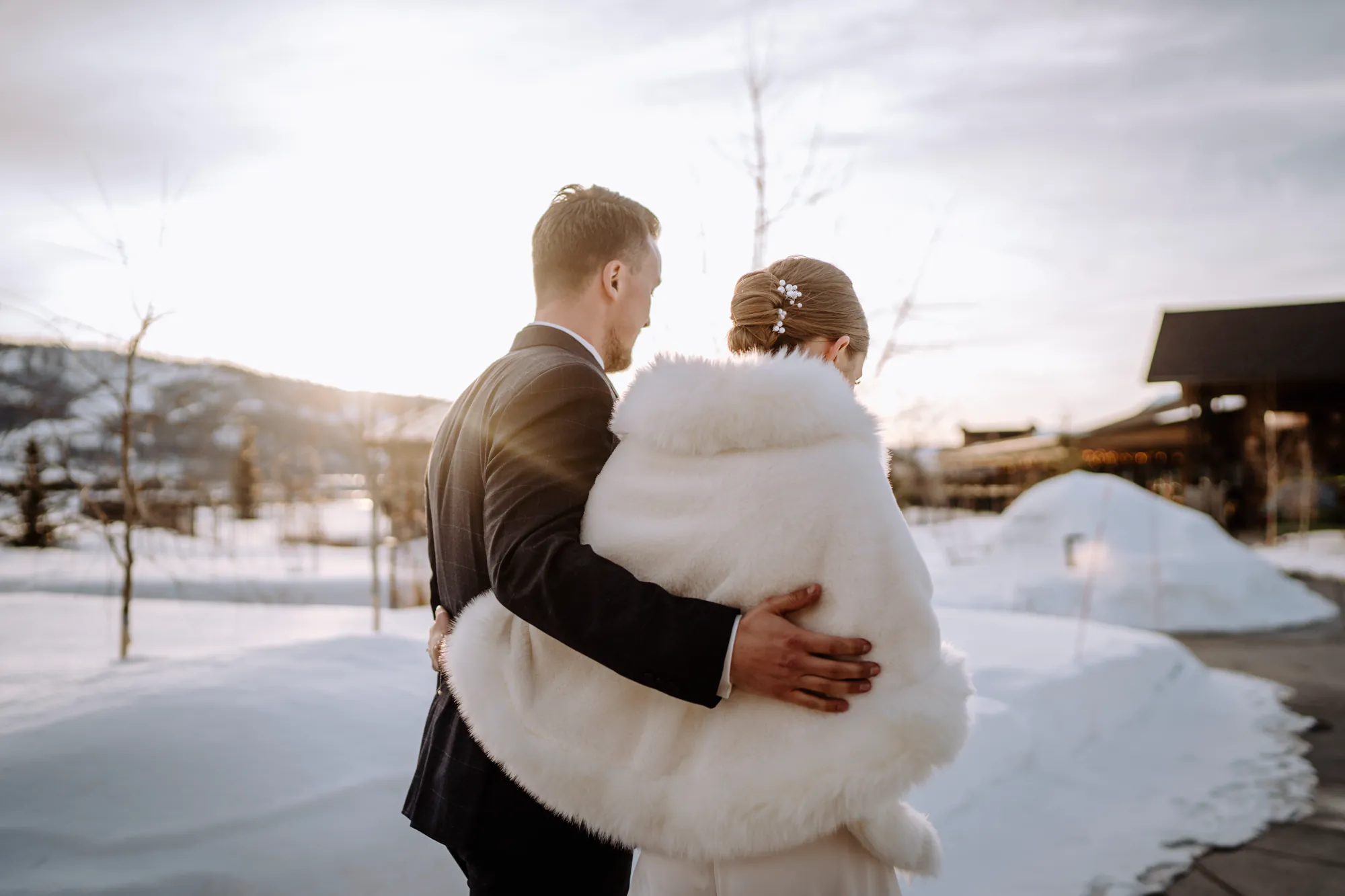 For the first look, we found a spot close to the venue. Snow, mountains, and perfect light. As Emily walked toward Leo, time seemed to stop for a moment. She looked like an ice princess. Leo was speechless, and there were definitely a few tears.