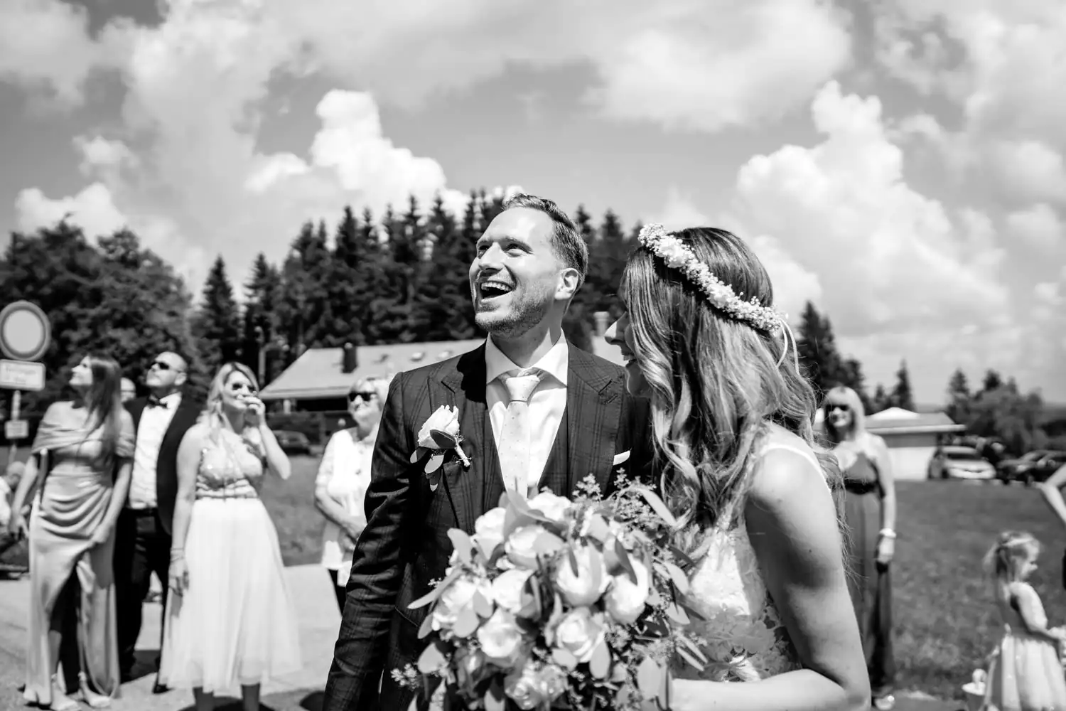 As they walked out of the registry office, Michaela and Thomas were greeted by their friends with an arch of bubbles. After that came family photos and group shots before everyone headed to the celebration. They celebrated at Freihaus Brenner in Bad Wiessee, a venue that fit the character of this wedding perfectly: warm, elevated, and beautifully understated.