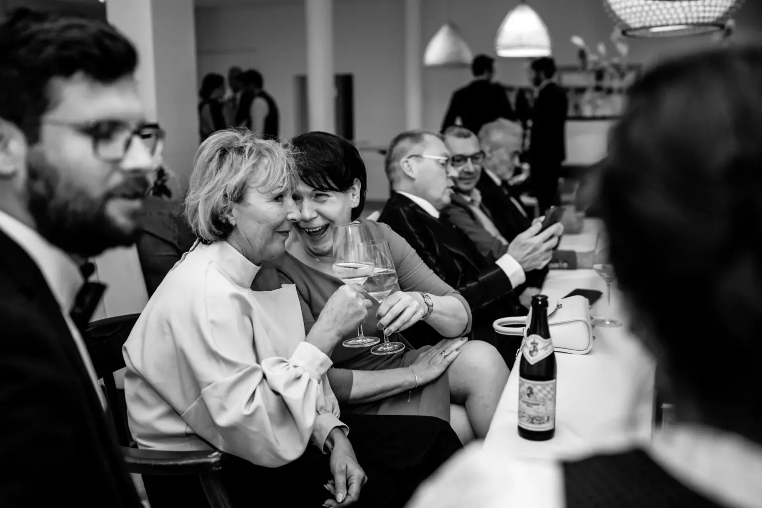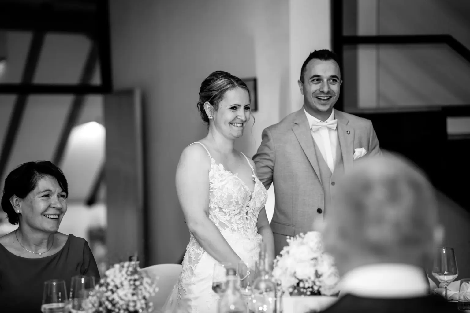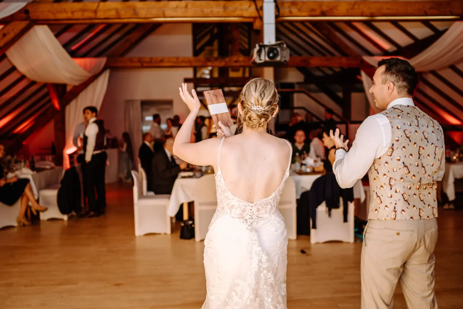 Der Nachmittag war erfüllt von liebevollen Einlagen der Gäste, bevor das Abendessen erneut ein kulinarisches Highlight von Whowantsit Catering wurde. Der Hochzeitstanz eröffnete eine lange, ausgelassene Partynacht – voller Lachen, Tanz, Cocktails und Freude. All diese Momente werden für Marie und Sascha in Hochzeitsfotos jenseits des Standards festgehalten, die die Geschichte ihres Tages erzählen.