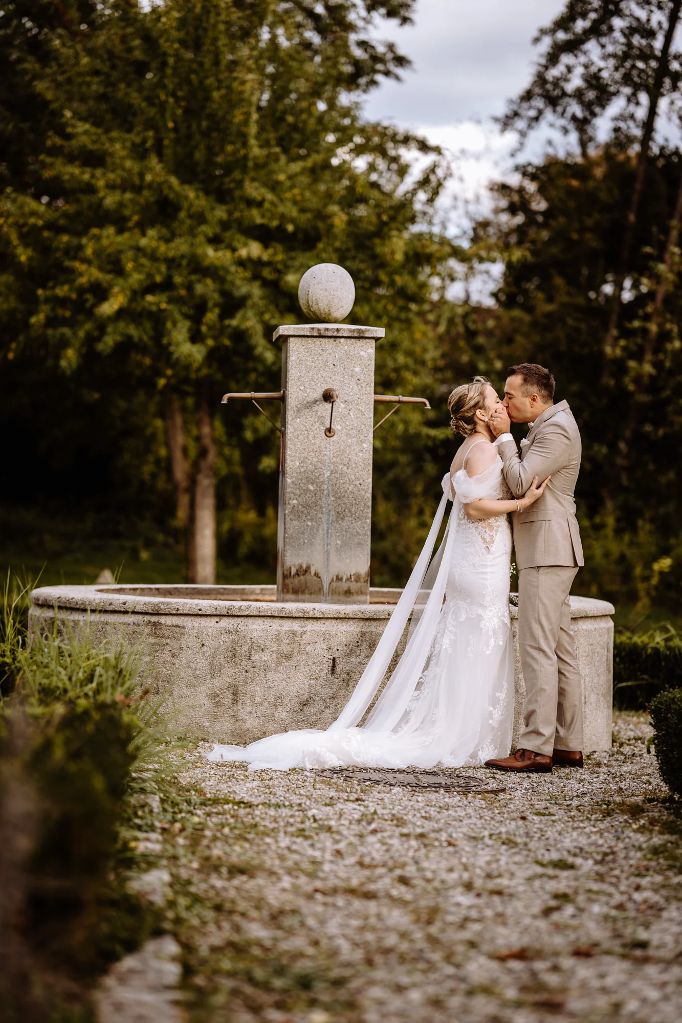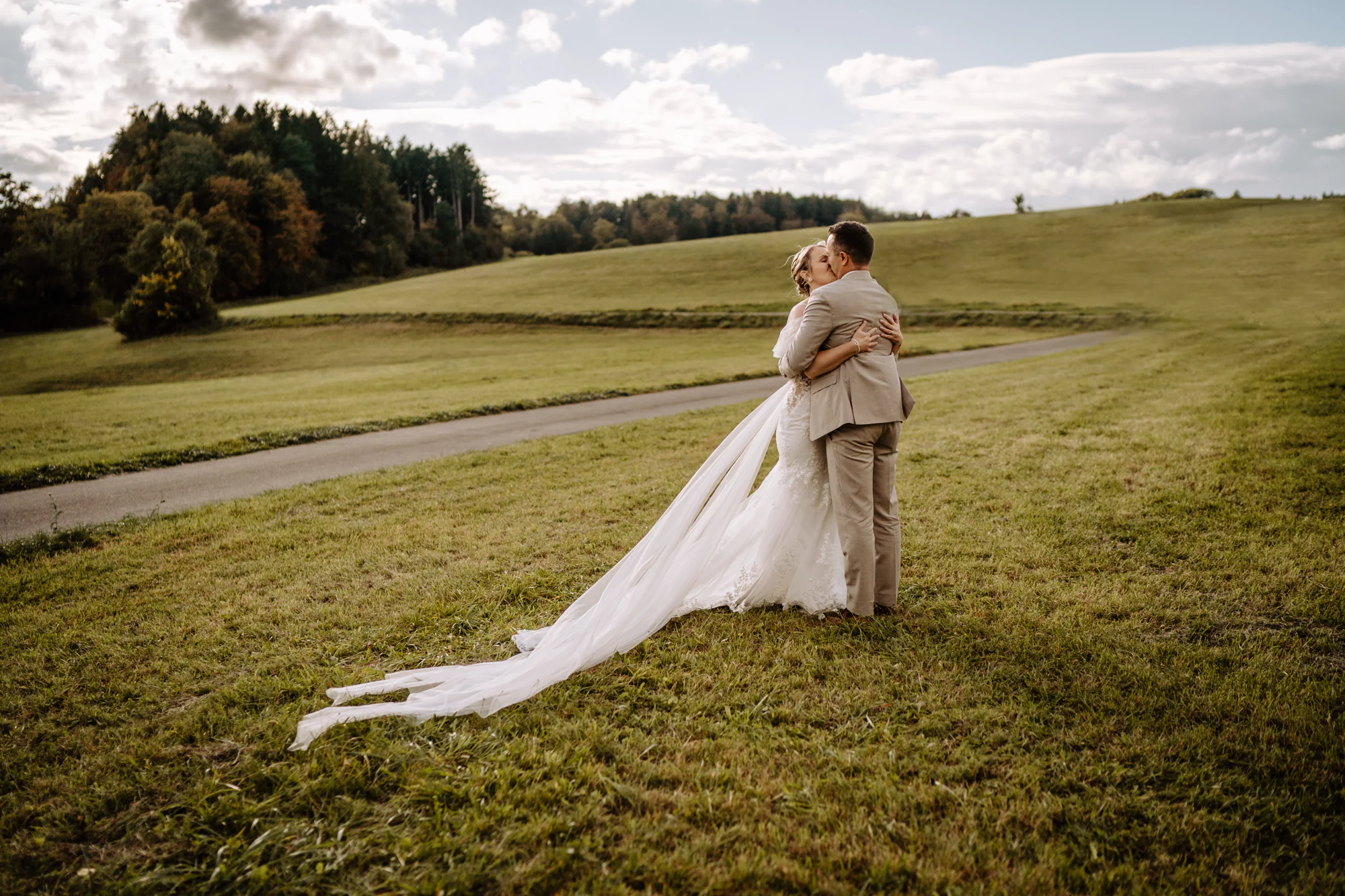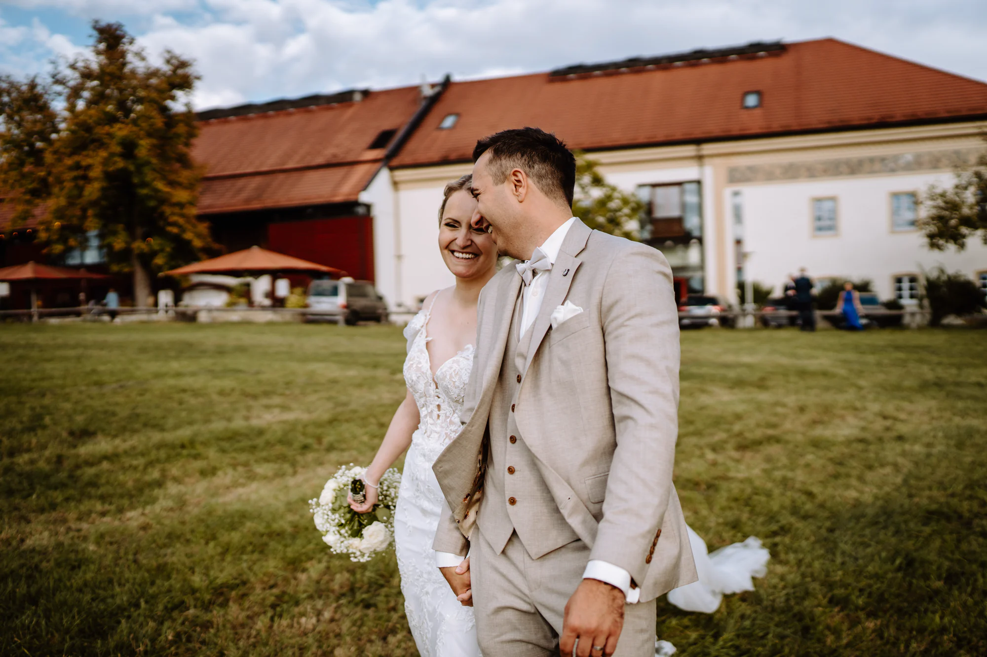 Nach der Trauung feierten die Gäste im Foyer mit Sektempfang und feinen Häppchen von Whowantsit Catering. Später schenkte uns das Wetter einen Moment im Freien, perfekt für Hochzeitsfotos, die über das Standardbild hinausgehen: Marie im traumhaften Kleid, das sich sanft im Wind wiegte, Sascha an ihrer Seite, die Berge im Hintergrund, grüne Wiesen und die Ruhe von Gut Kerschlach – eine Kulisse, die jedes Bild zu einer Geschichte macht.