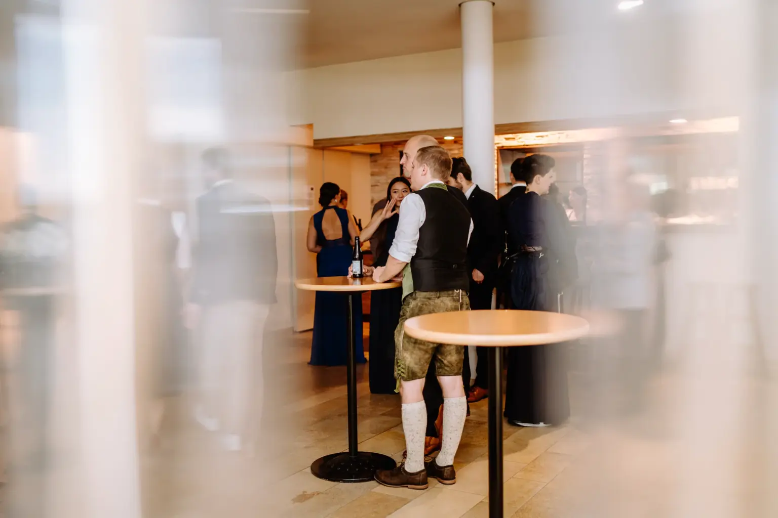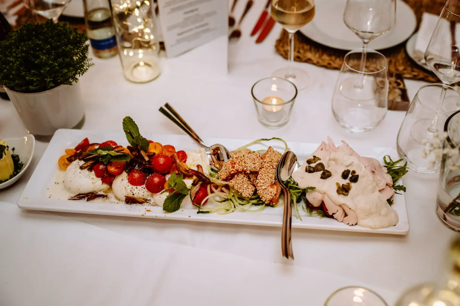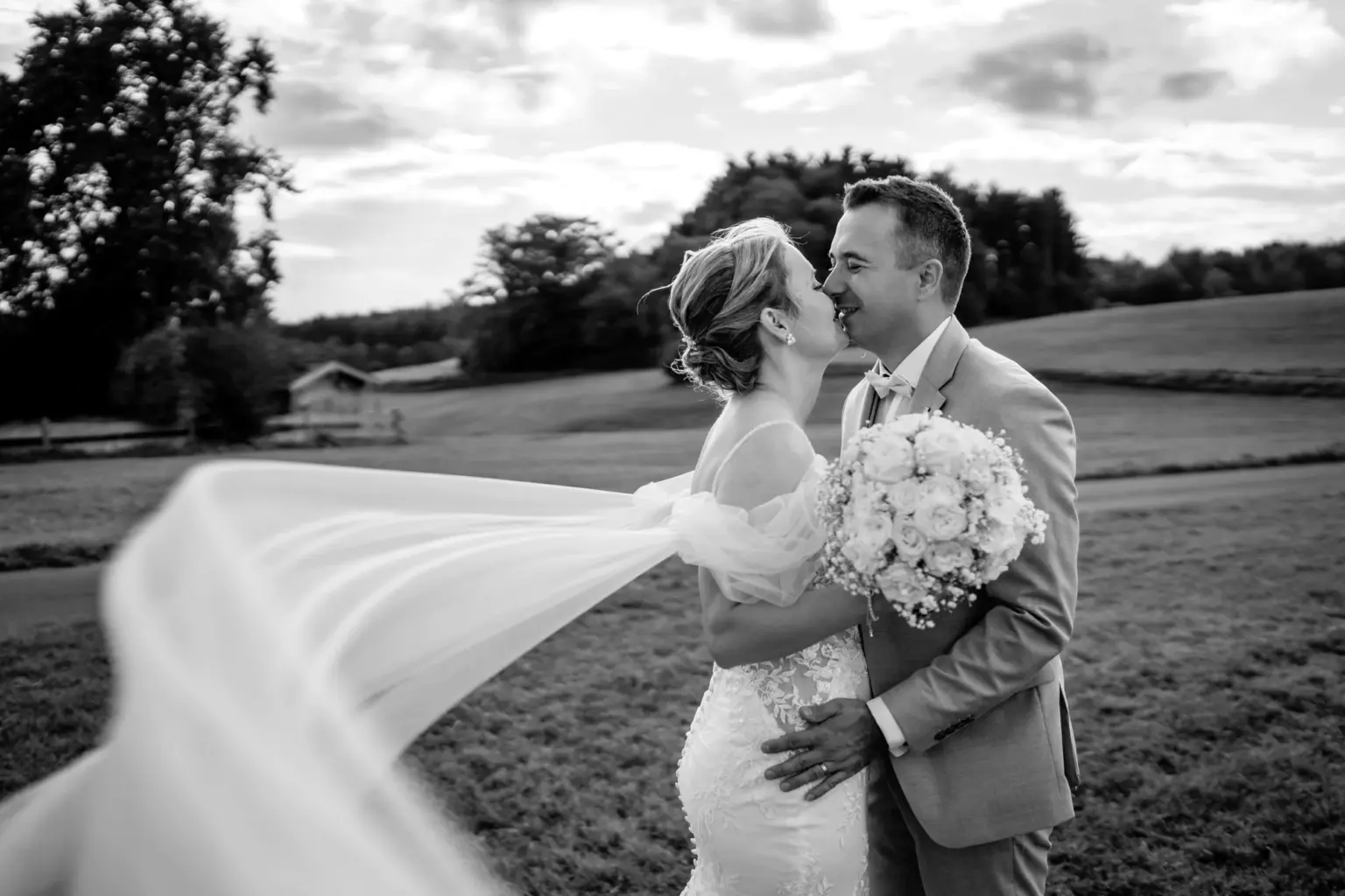 Nach der Trauung feierten die Gäste im Foyer mit Sektempfang und feinen Häppchen von Whowantsit Catering. Später schenkte uns das Wetter einen Moment im Freien, perfekt für Hochzeitsfotos, die über das Standardbild hinausgehen: Marie im traumhaften Kleid, das sich sanft im Wind wiegte, Sascha an ihrer Seite, die Berge im Hintergrund, grüne Wiesen und die Ruhe von Gut Kerschlach – eine Kulisse, die jedes Bild zu einer Geschichte macht.