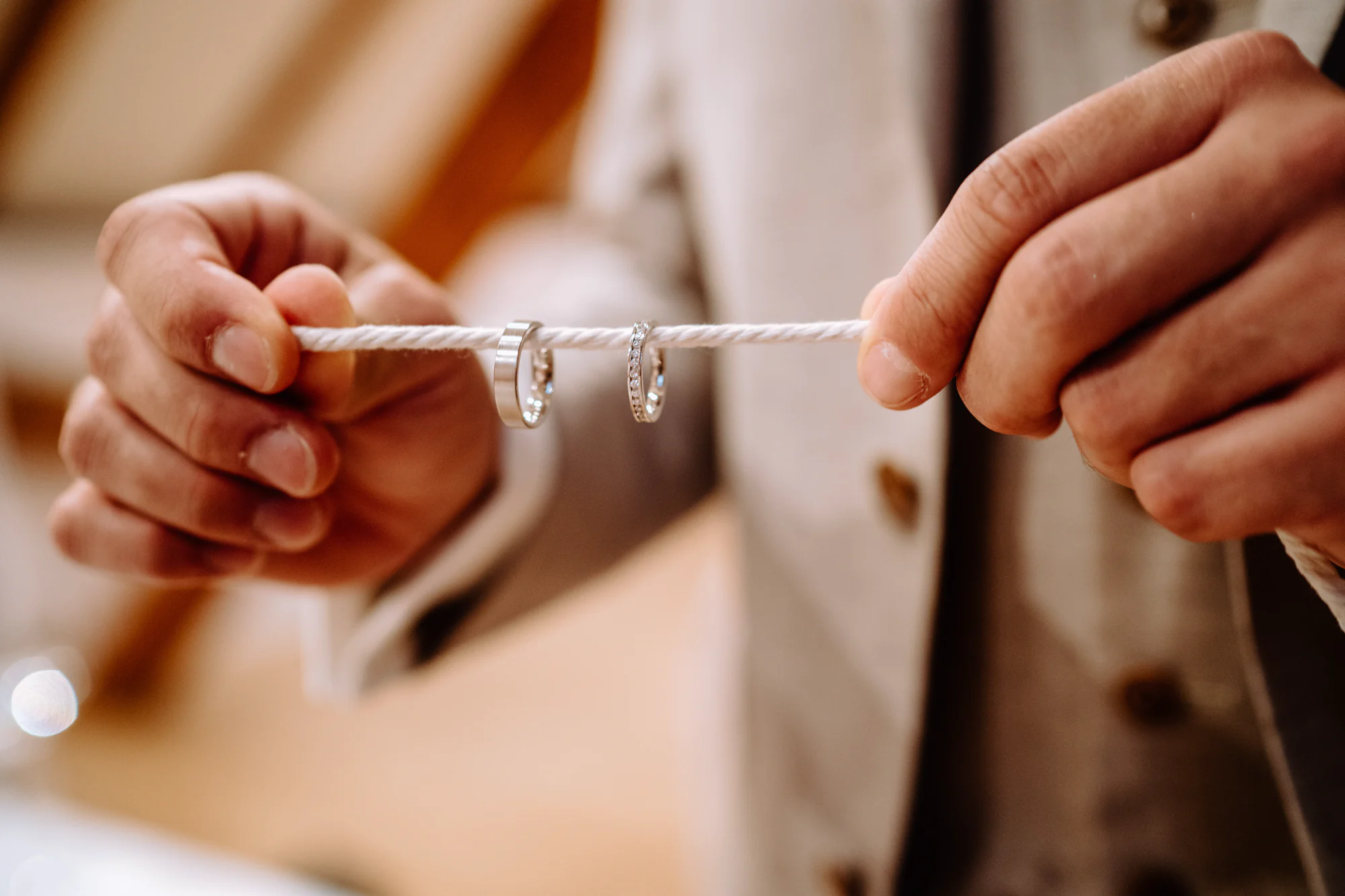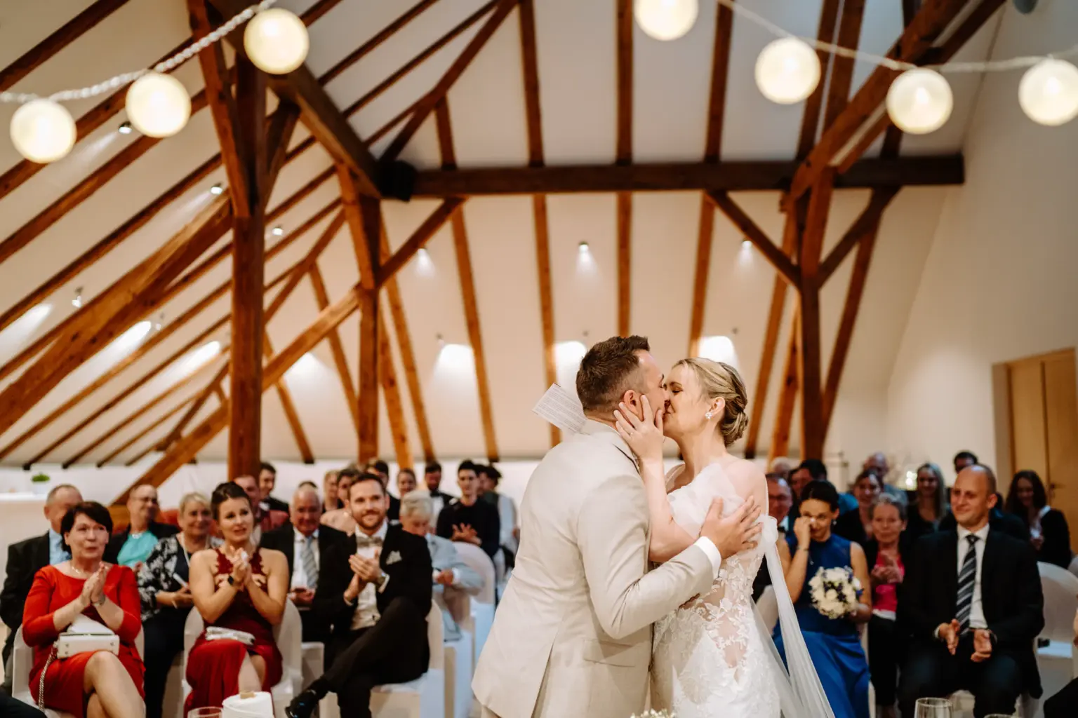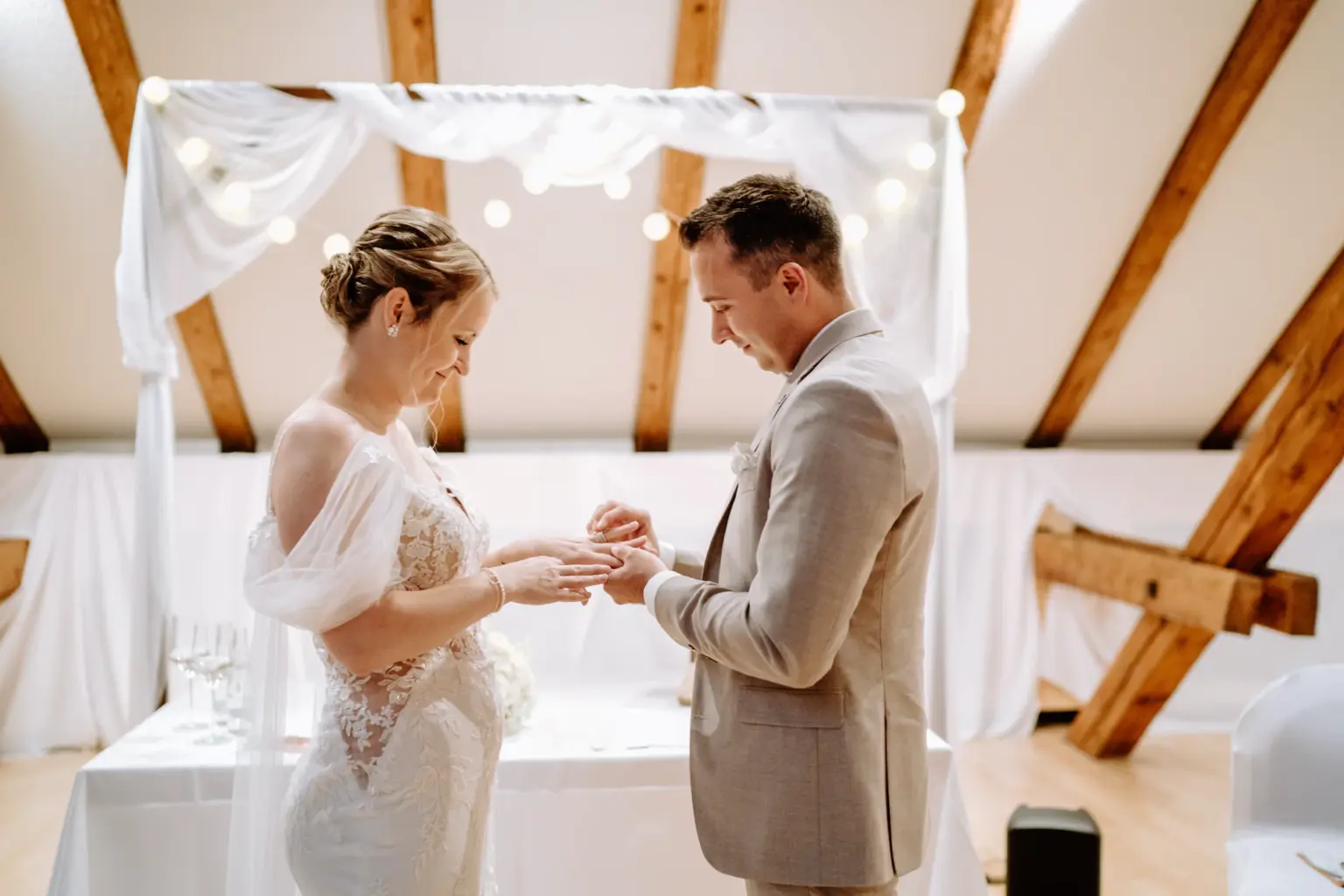 Die Traurede, perfekt auf Marie und Sascha abgestimmt, erzählte ihre Geschichte voller Intimität und Persönlichkeit. Besonders berührend war das Ritual mit den Ringen, die durch die Gäste gingen – ein Symbol der Verbundenheit, das in Hochzeitsfotos für die Ewigkeit festgehalten wurde.