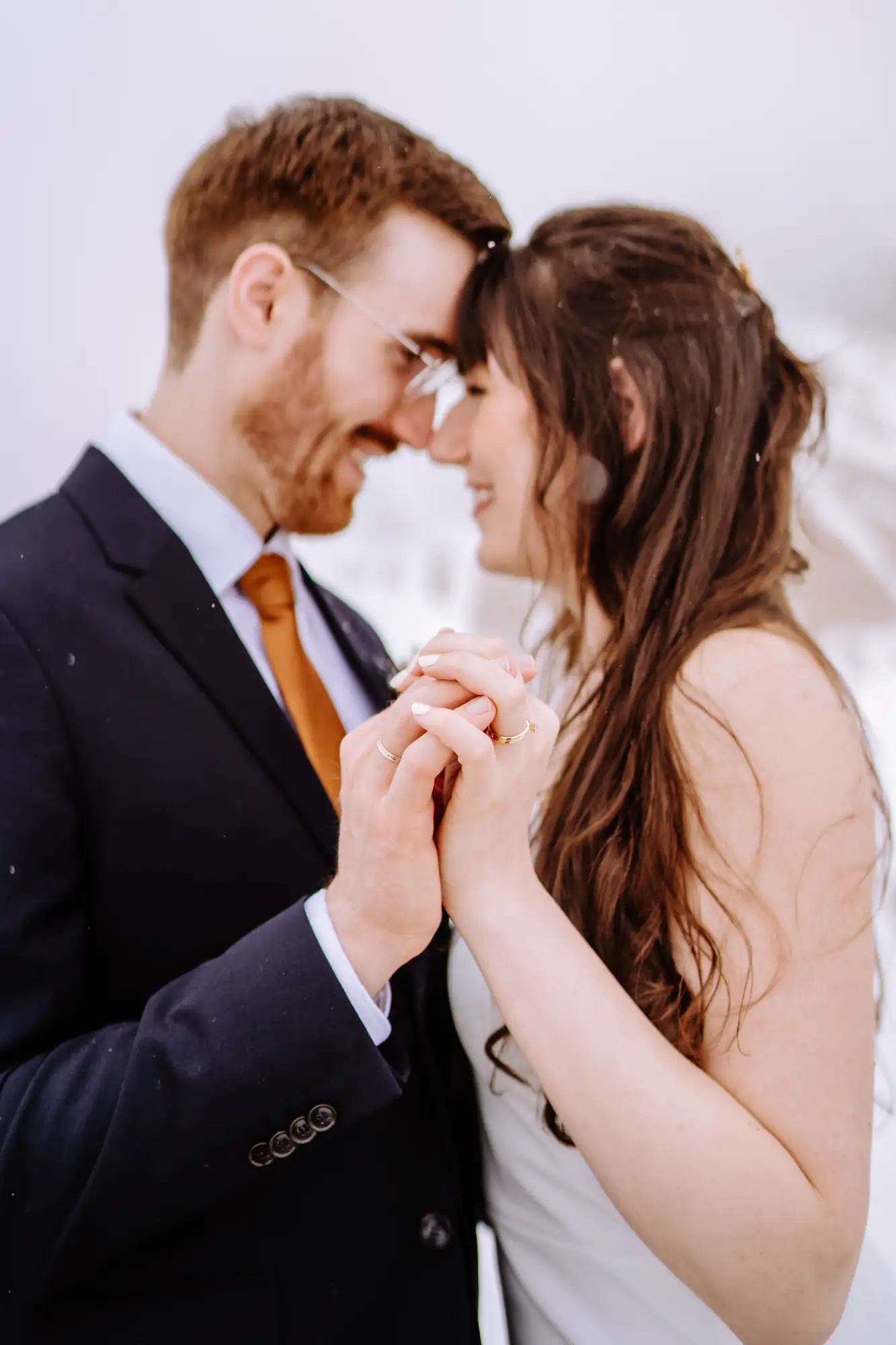 Nach der Trauung folgte ein zweiter Teil des Paarshootings. Trotz Mai überraschte uns die Zugspitze mit Schneefall und leider ohne Weitblick. Doch auch solche Dinge machen eine Zugspitzhochzeit zu etwas ganz Besonderem. Die Stille, der Schnee und die Nähe zwischen den beiden schufen eine unglaublich romantische Stimmung. Diese Hochzeitsfotos erzählen von einer Berghochzeit, die nicht perfekt sein musste, um doch perfekt zu sein.