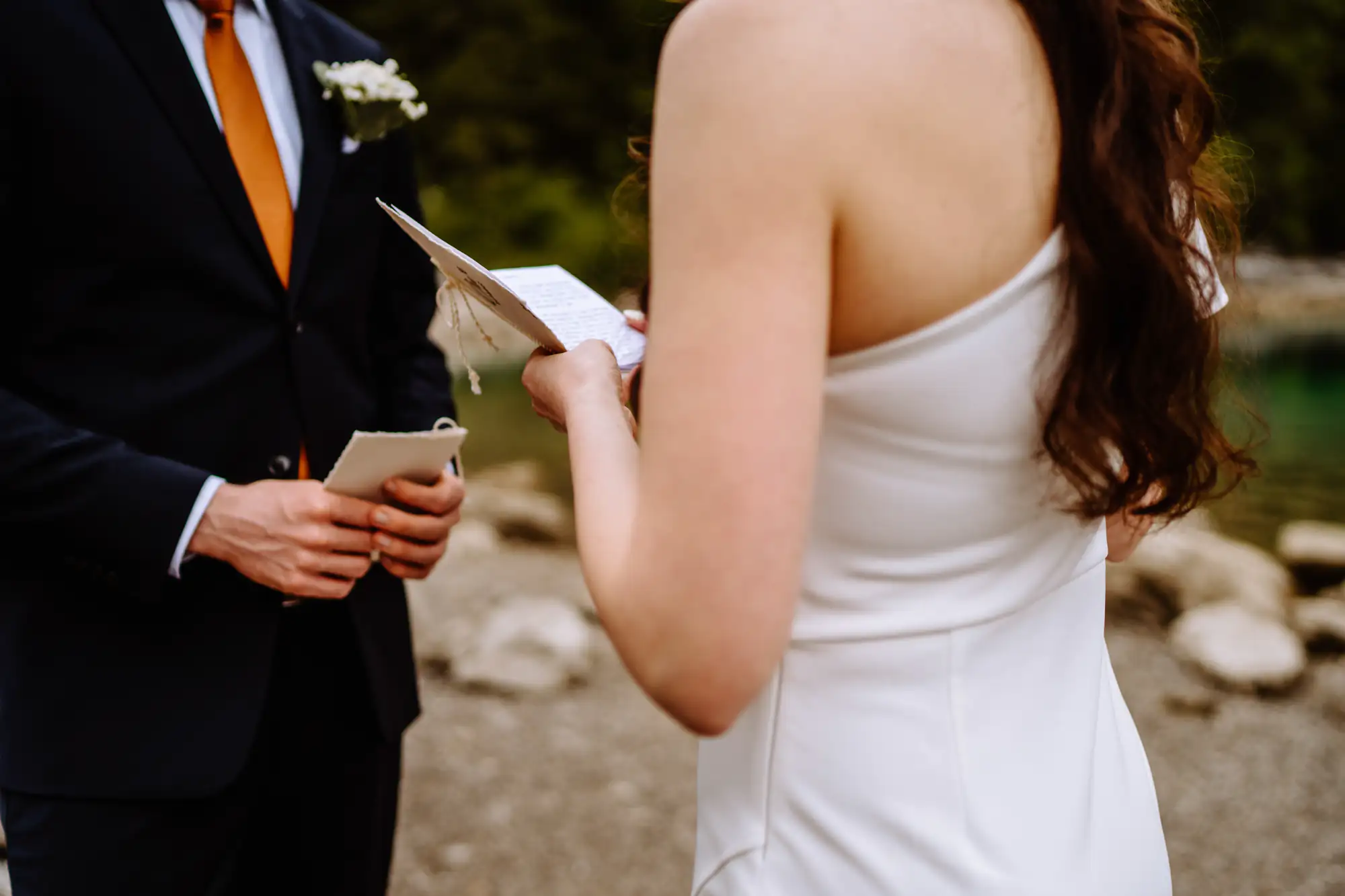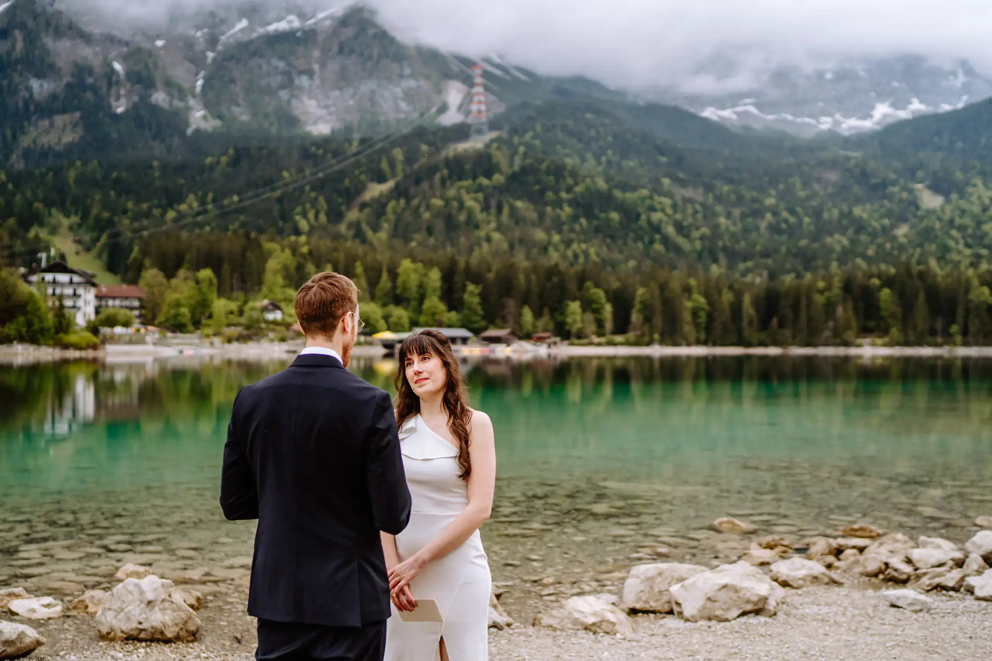 Wir trafen uns am Parkplatz am Eibsee, ein Ort, der für Hochzeitsfotos einfach einzigartig ist. Direkt am Ufer starteten wir mit den ersten Hochzeitsfotos am Eibsee. Die Kulisse aus dem grün schimmernden Wasser, der Zugspitze im Hintergrund, gepaart mit neugierigen Enten war unvergesslich. Schon während dieses ersten Paarshootings wurde es sehr emotional. Iva und Max nutzten diese exklusive Zeit nur für sich, um sich persönliche Worte vorzulesen. Es flossen erste Tränen. Genau diese Momente machen Hochzeitsfotos lebendig und echt und halten Gefühle für immer fest.