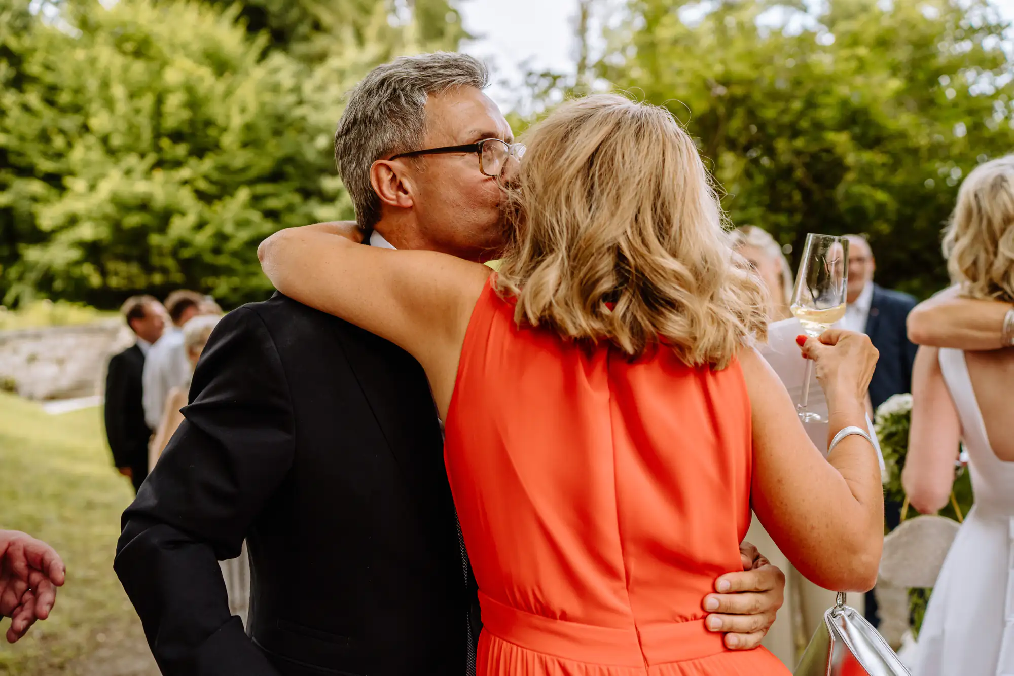 Beim anschließenden Sektempfang gab es Live Cooking direkt am See, entspannt, hochwertig und einfach richtig gut. Familienfotos, Gruppenbilder und der Anschnitt der Torte fügten sich ganz natürlich in den Ablauf ein. Als dann ein kleines Sommergewitter aufzog, sind wir kurzerhand in die wunderschön dekorierte Orangerie gewechselt. Dort startete das Hochzeitsmenü, begleitet von liebevollen und sehr persönlichen Einlagen von Familie und Freunden. Diese Momente haben so deutlich gezeigt, wie sehr die beiden geliebt werden und was für eine besonderer Freundeskreis sie umgibt.