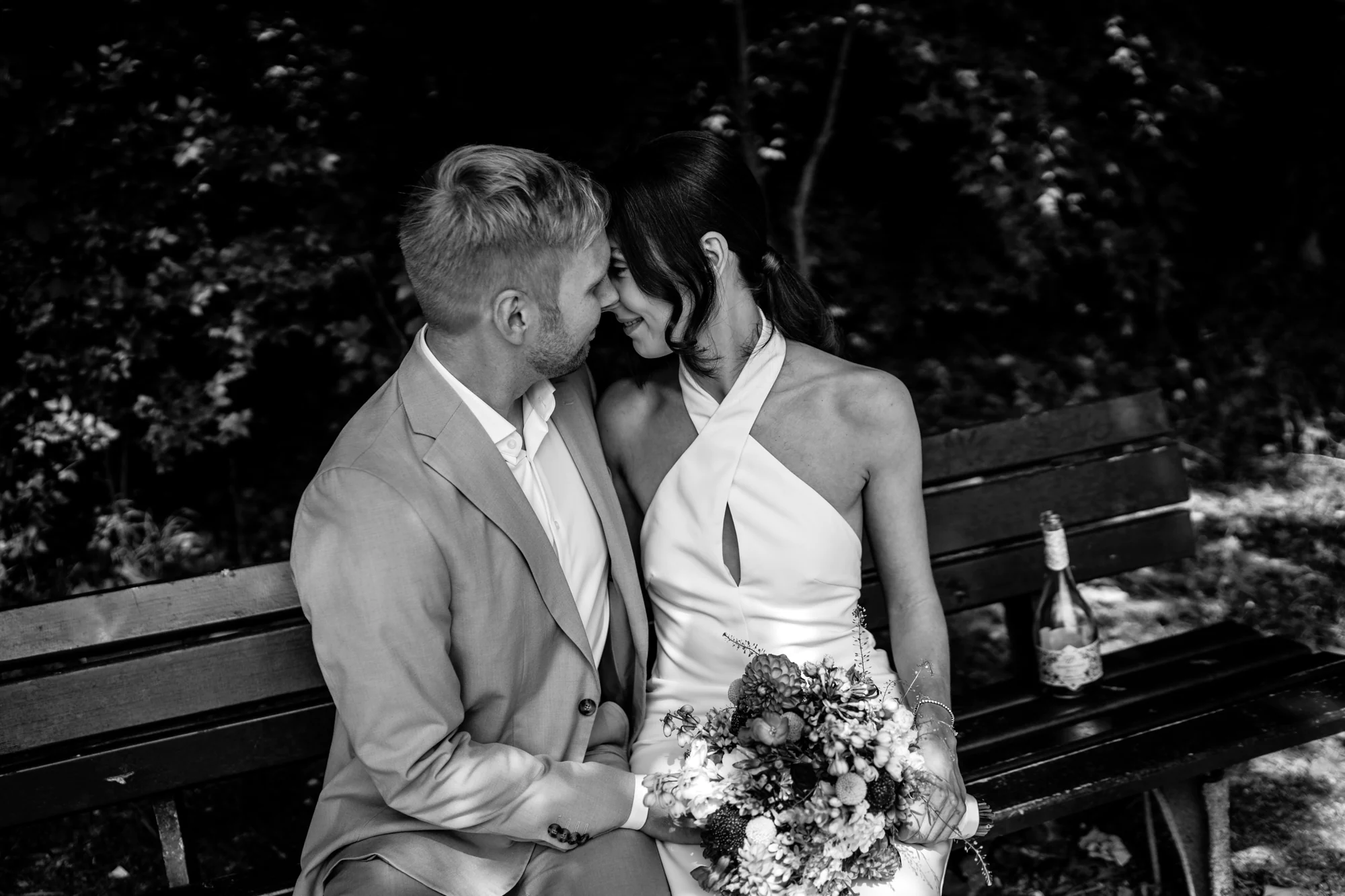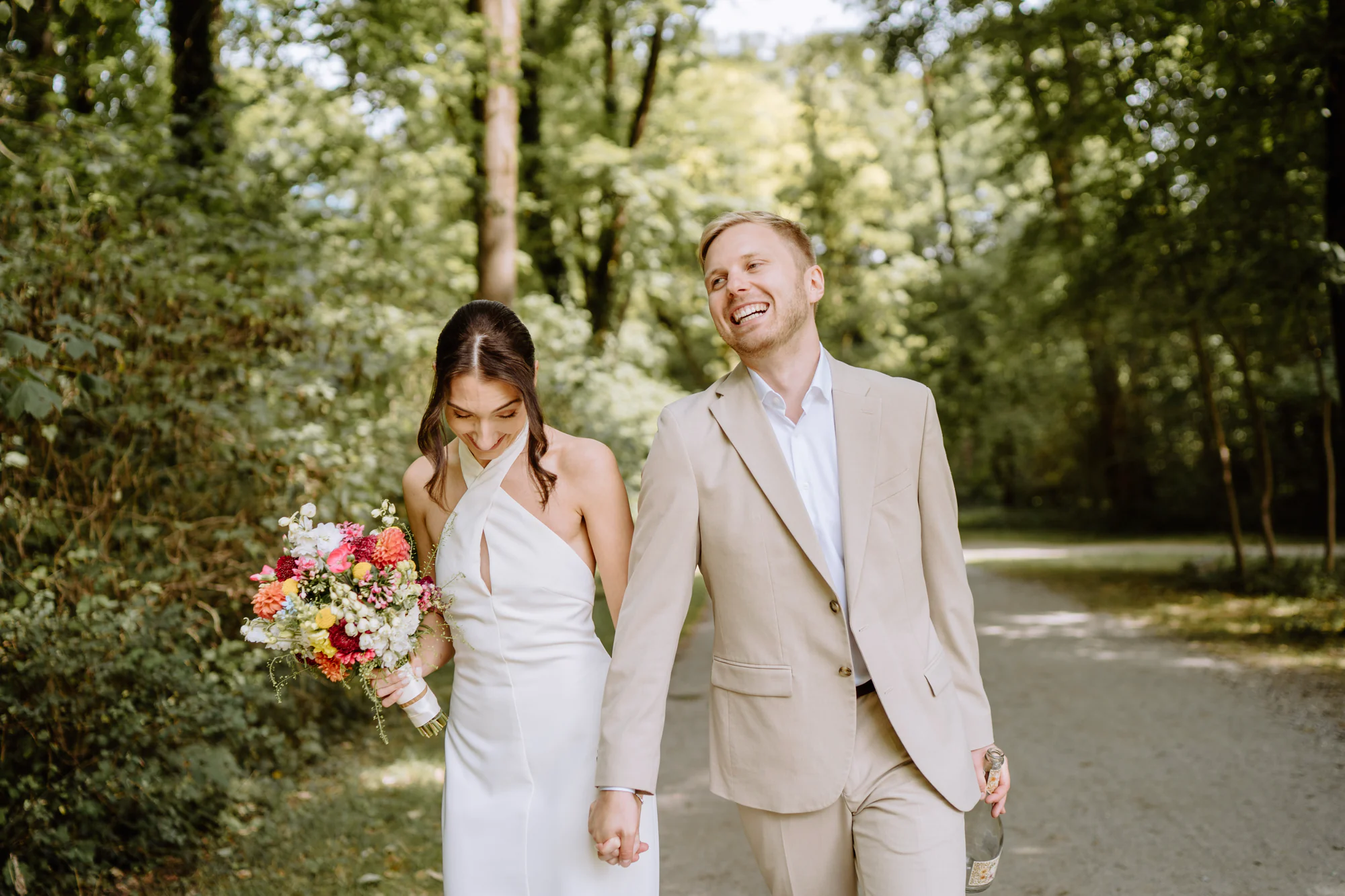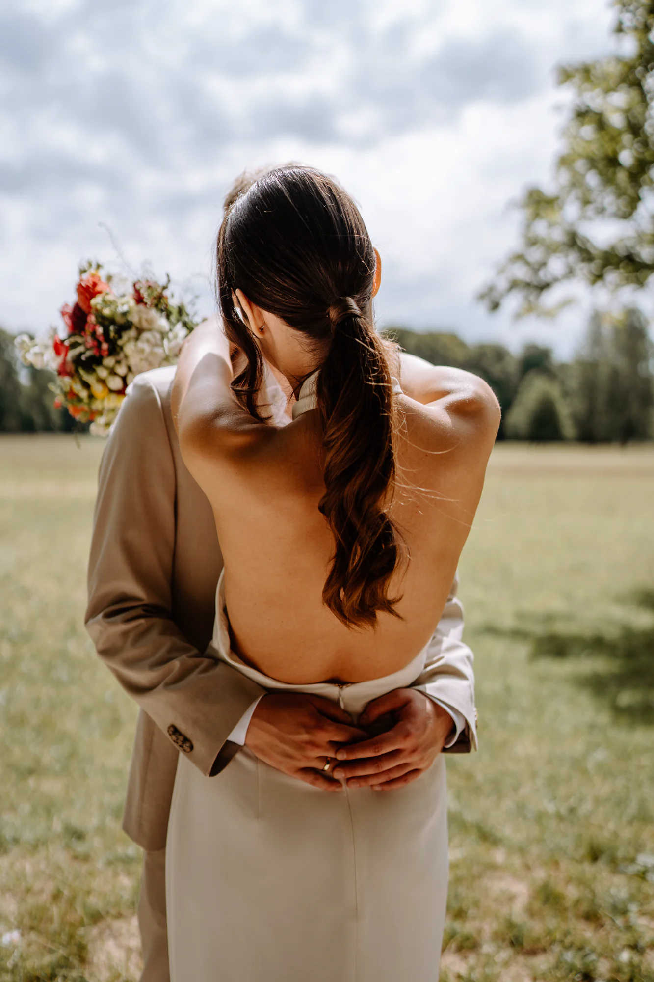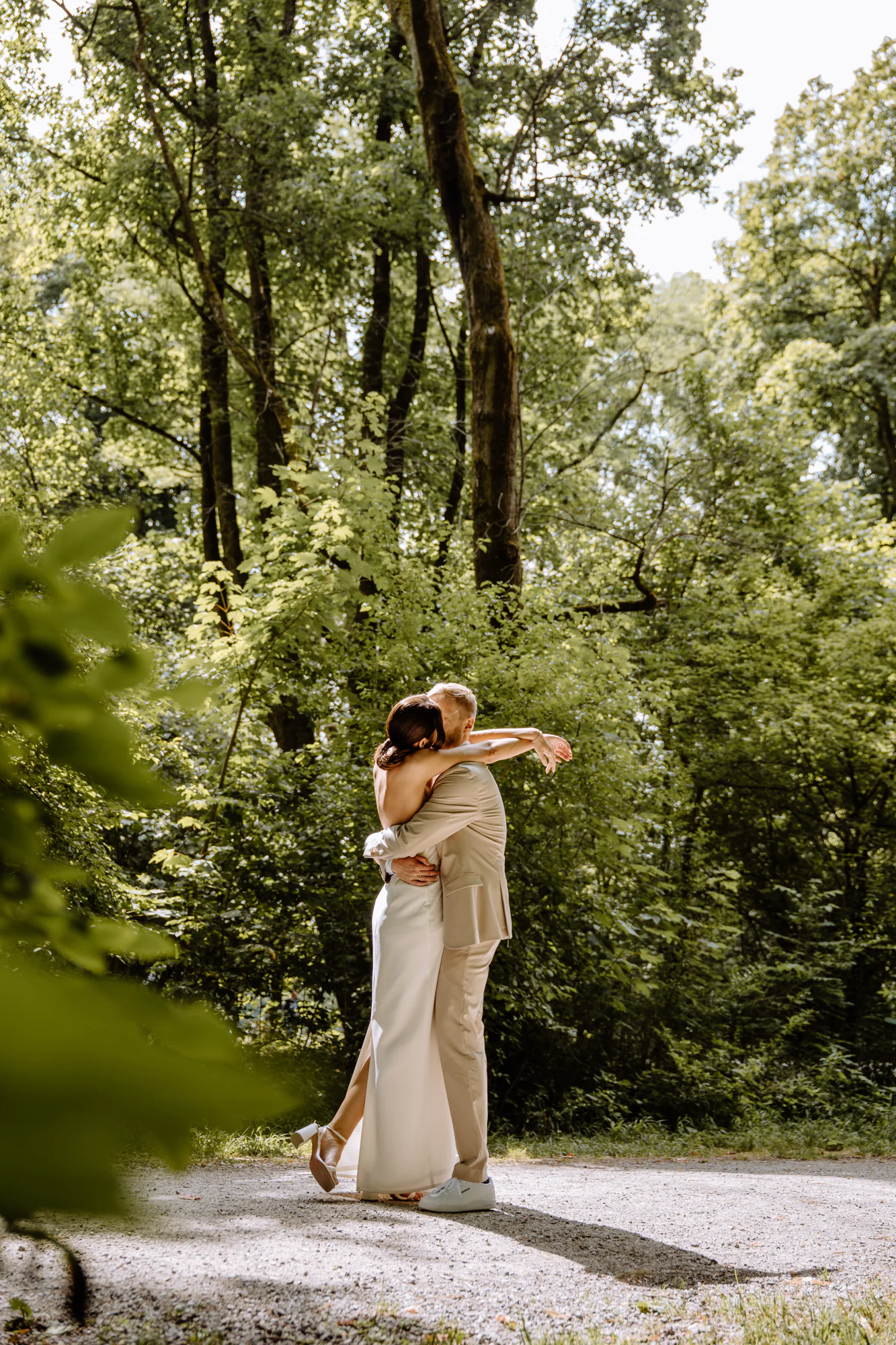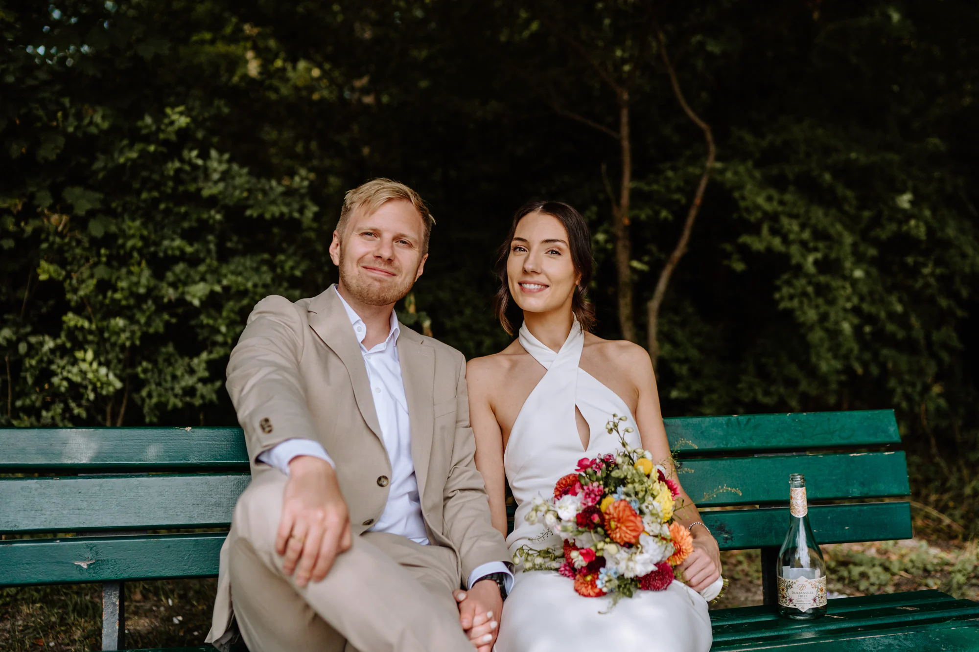 Der Julitag zeigte sich von seiner angenehmen Seite. Sonnenschein, warmes Licht, viel Grün, eine ganz besondere Stimmung unter der Woche. Nach einem kurzen Sektempfang zogen wir uns zu dritt zum Paarshooting zurück. Für mich ist ganz besonders wichtig, dass wir zusammen eine ganz entspannte Atmosphäre schaffen und so meine Paare gar nicht dran denken, dass wir gerade fotografieren. Mit viel Spaß in gemeinsamen Momenten die ich nur für die beiden schaffe, entstehen gefühlt ganz nebenbei Fotos für die Ewigkeit. Die beiden sind entspannt durch den Park gelaufen, blieben stehen, sprachen miteinander, lachten, tranken ihren Lieblingssekt, den sie auf der Südafrika-Reise ebenfalls getrunken haben und konnten diese Zeit des Tages einfach zu zweit genießen. Genau in diesen Momenten entstehen Bilder, die nicht nach einem klassischen Fotoshooting aussehen, sondern nach Zeit, die man miteinander verbringt.