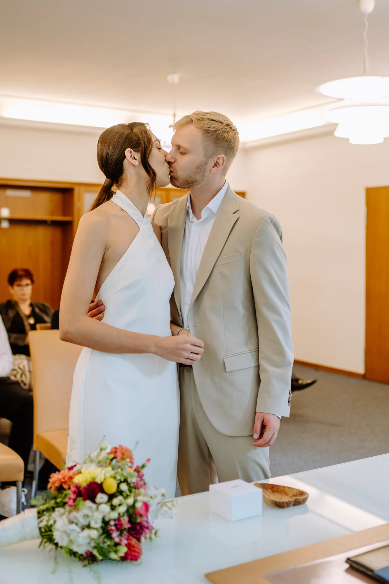 Die Trauung fand im engsten Familienkreis statt. Eltern, Geschwister und nur die Liebsten begleiteten das Paar an diesem Vormittag. Die Stimmung war entspannt und voller Vorfreude. Gerade in solchen Momenten zeigen sich Emotionen oft leise. Ein Blick, der länger hält als sonst. Ein kurzes Lächeln, das mehr sagt als Worte. Hände, die sich finden, ohne darüber nachzudenken.