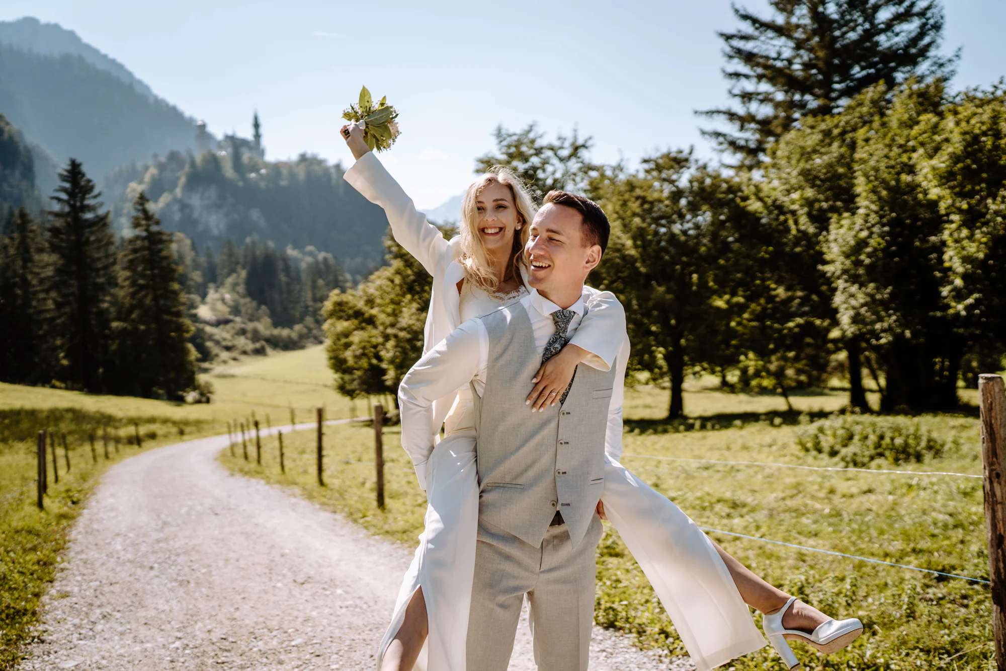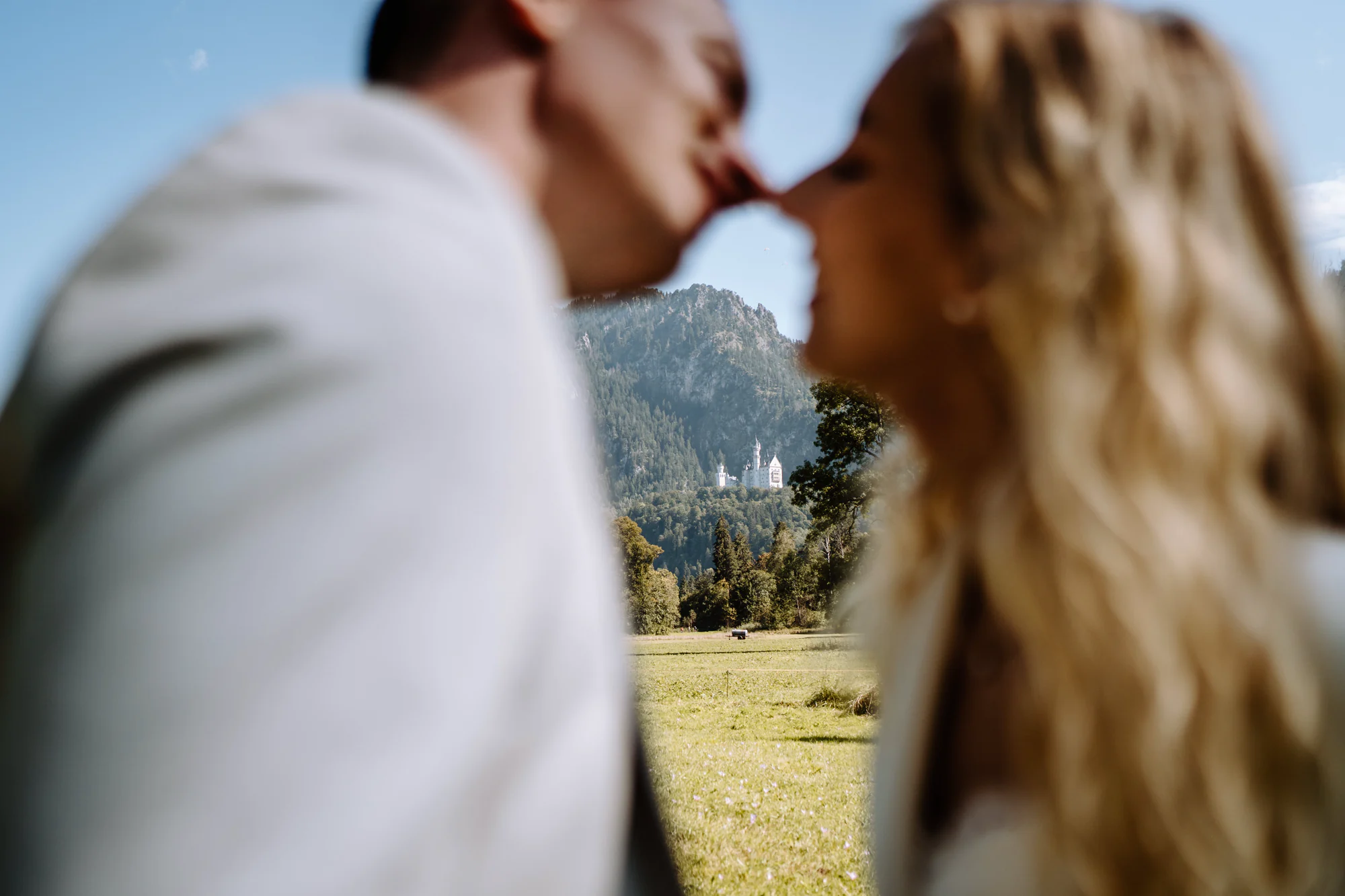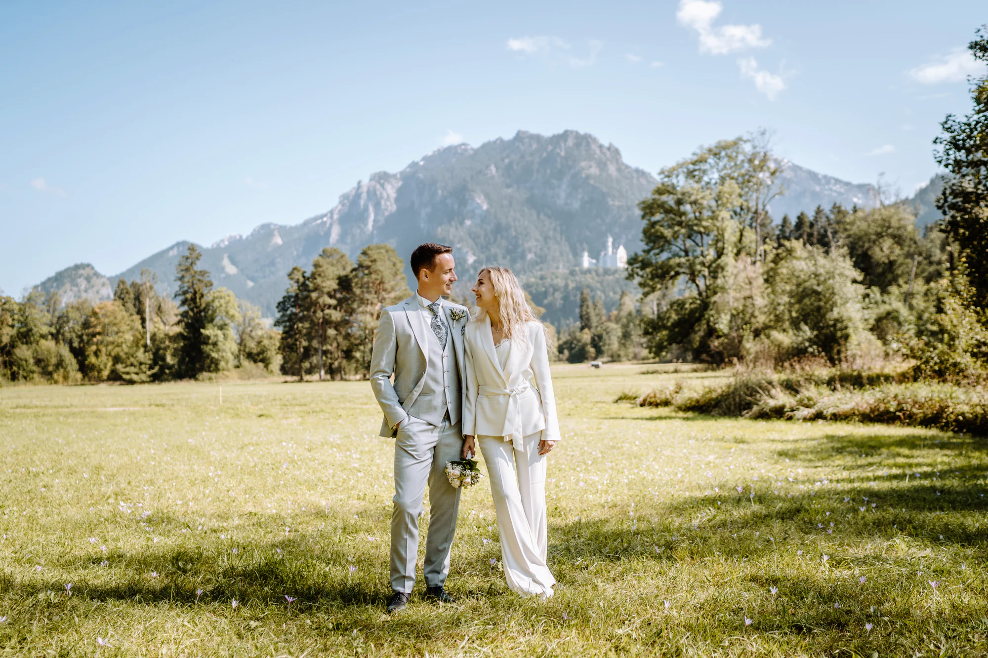 Abgerundet wurden die Hochzeitsfotos an einer weiteren Fotolocation mit dem Schloss Neuschwanstein im Hintergrund. Dieses beeindruckende Panorama hatte etwas Zeitloses und Magisches und verlieh den Bildern eine ganz besondere Tiefe. Die majestätische Kulisse des Schlosses, eingebettet in die Landschaft des Allgäus, machte diesen Hochzeitstag in Füssen vollkommen und ließ Erinnerungen entstehen, die weit über diesen Moment hinaus wirken.