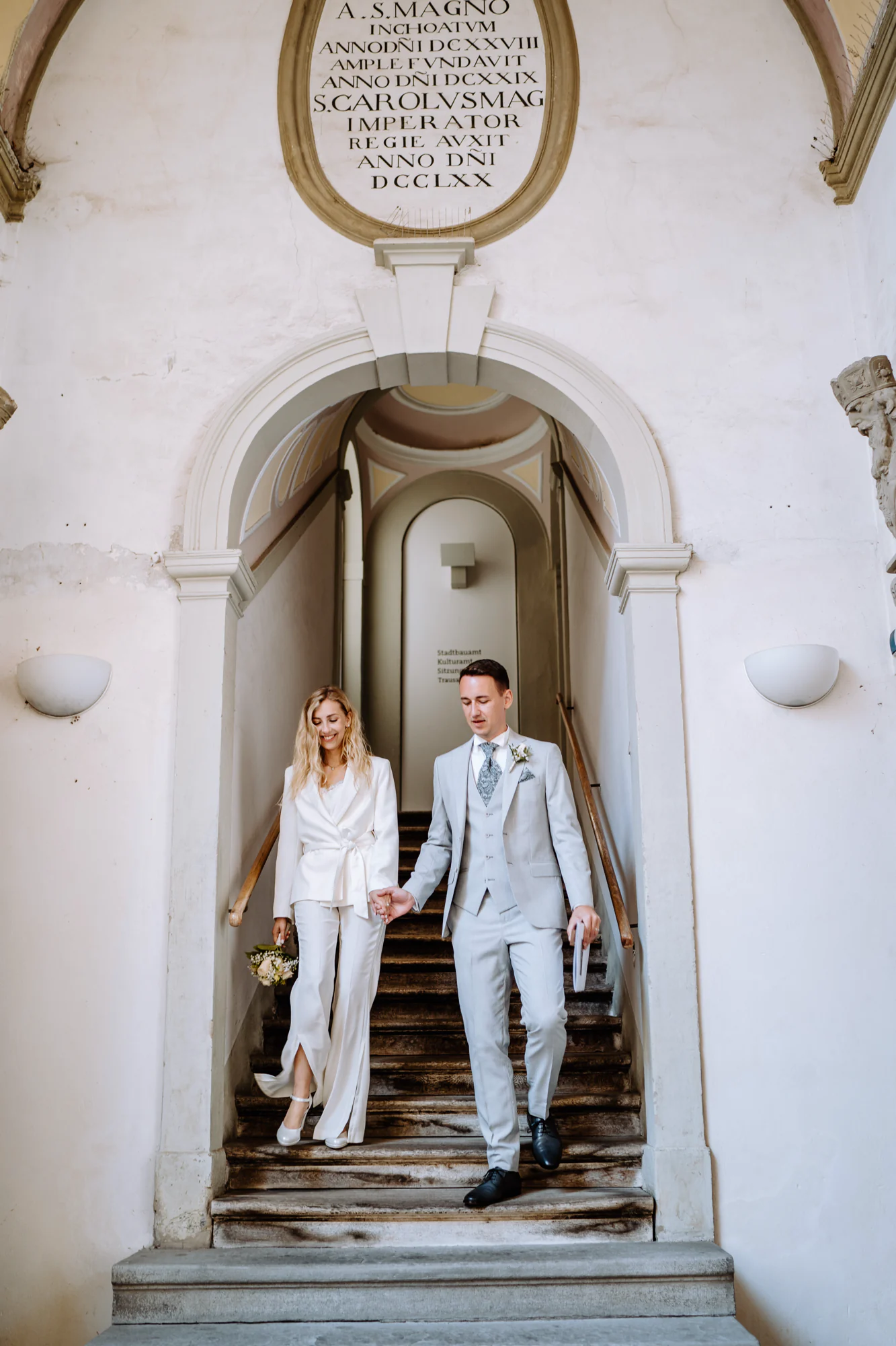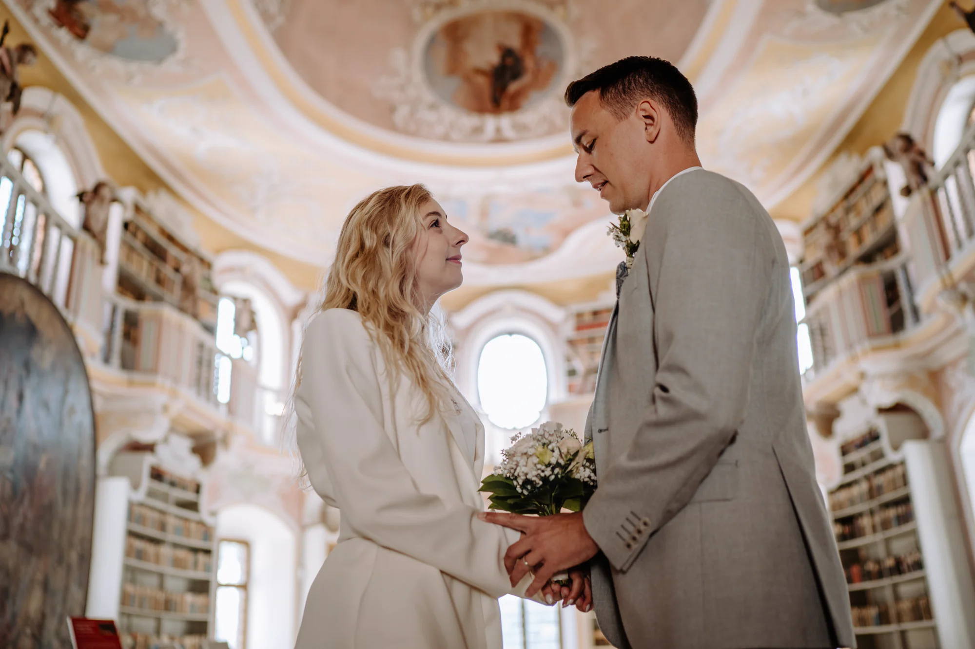Nach der Trauung durften wir Hochzeitsfotos in der Bibliothek machen. Umgeben von jahrhundertealten Büchern entstand eine ganz besondere, beinahe ehrfürchtige Atmosphäre. Dieser Ort strahlte so viel Ruhe, Geschichte und Tiefe aus, dass sich alles ganz von selbst entschleunigte.