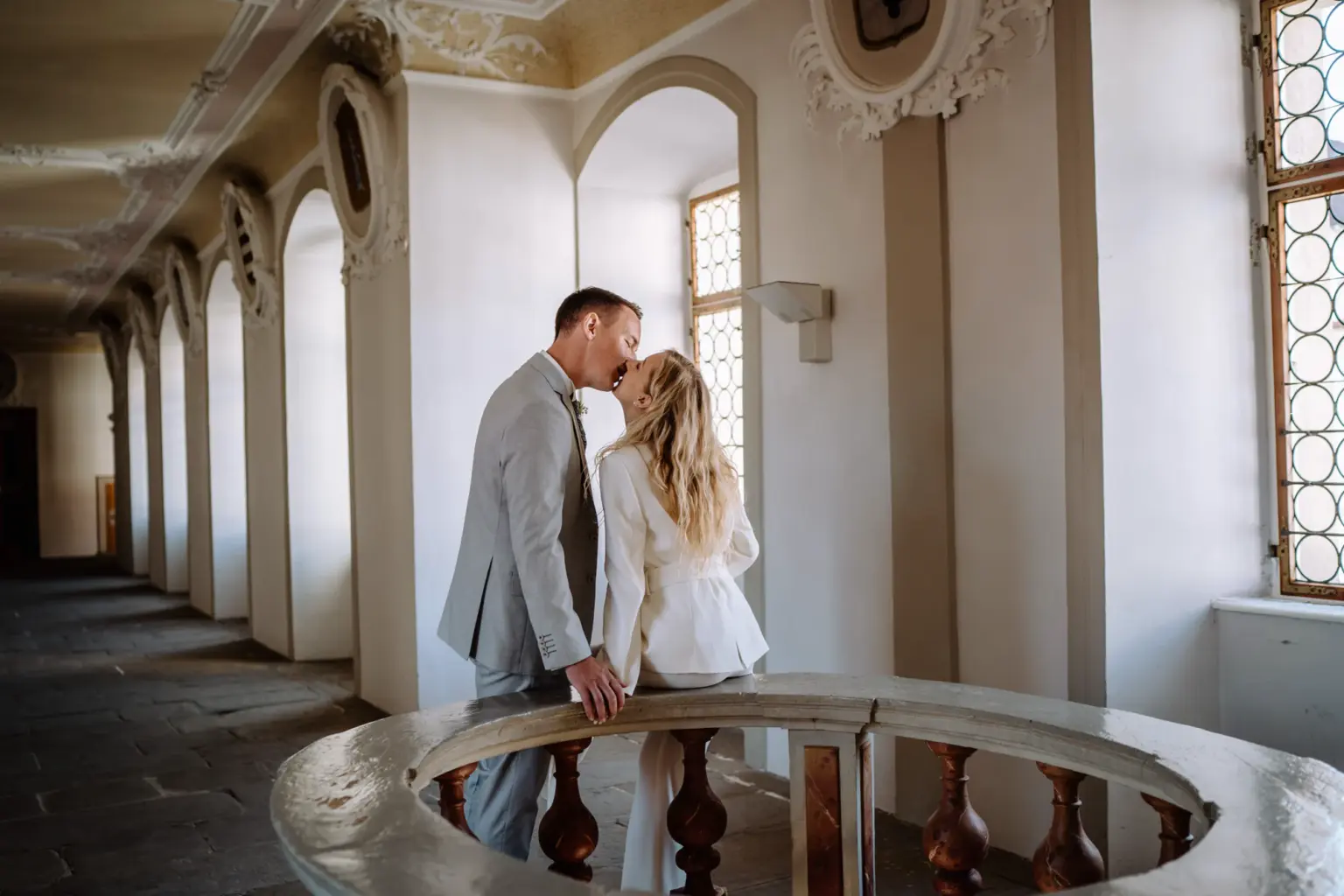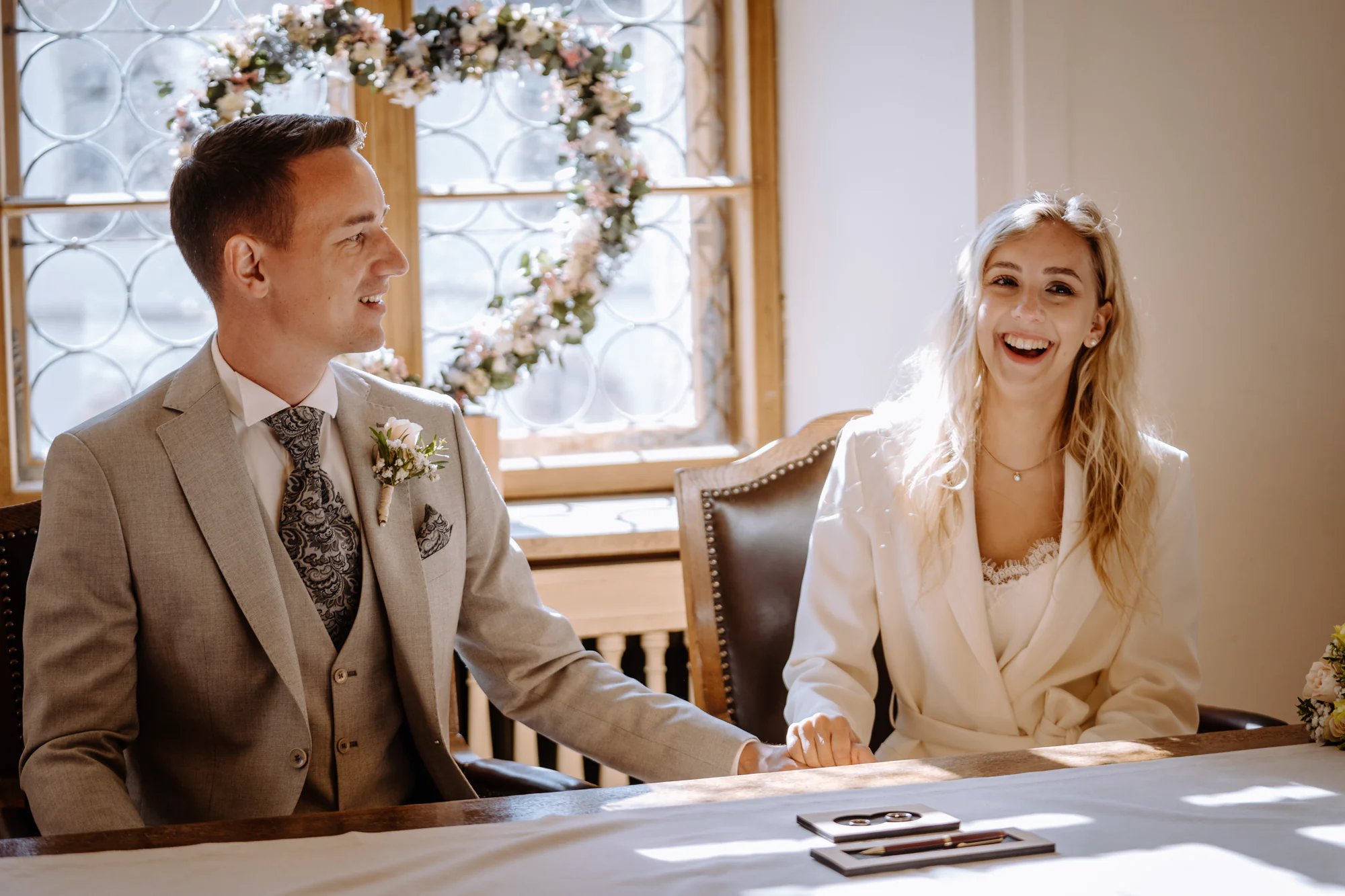 Gemeinsam fuhren wir anschließend nach Füssen ins Rathaus zur standesamtlichen Trauung im Standesamt Füssen. Die Zeremonie war wundervoll, getragen von Nähe, Wärme und tiefen Emotionen. Während sie sich das Ja-Wort gaben, begleitete uns die Sonne durch die Fenster des Trausaals und tauchte alles in eine fast magische Stimmung.
